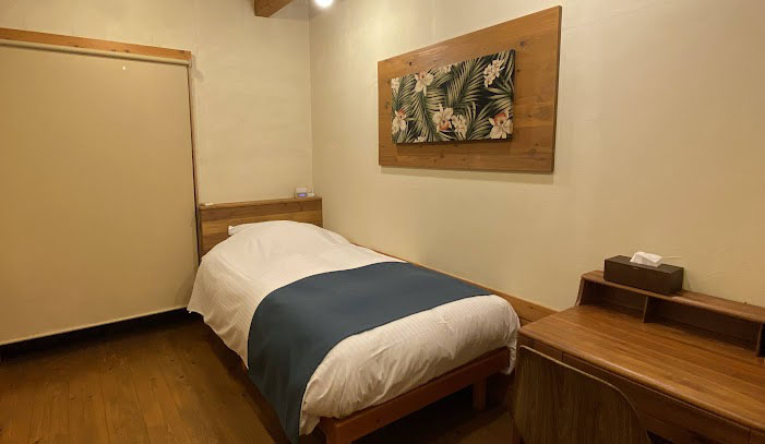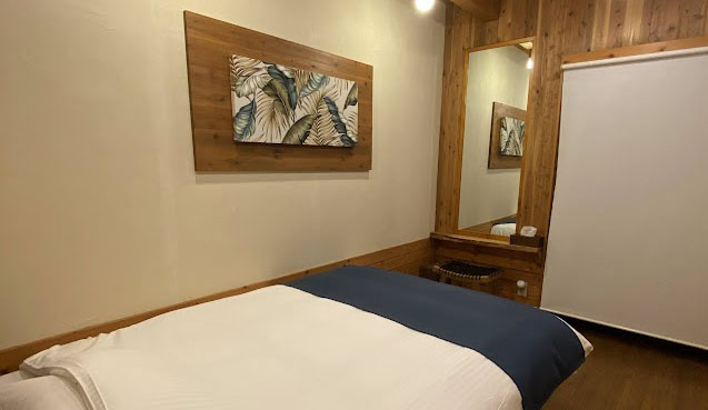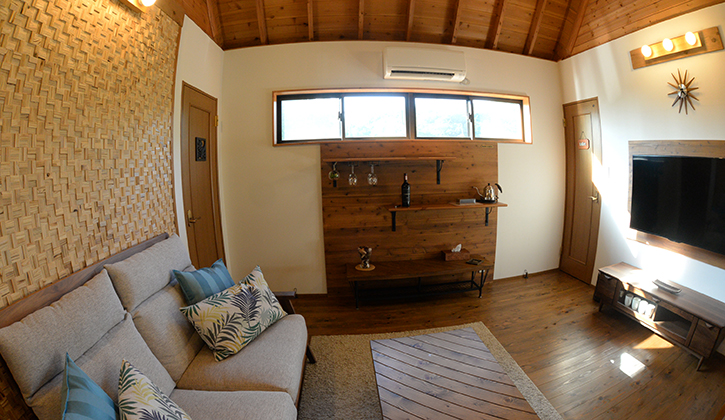 宿泊棟コテージには、ロフトまで吹き抜け天井になったリビングと1階に個室が2部屋、ロフトに2部屋あり計6台のベッドをご用意しております。ファミリープランでは、小さなお子様と一緒に添い寝ができるように海側のロフトには、セミダブルとシングルを繋ぎ合わせてベッドを設置することができます。