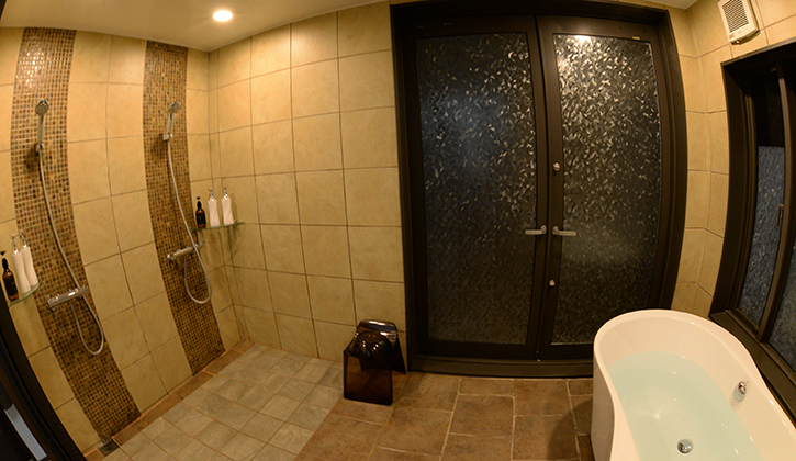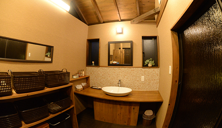 宿泊棟コテージとは別棟となるお風呂棟には、露天風呂と内風呂の2ヶ所のお風呂をご用意しております。どちらも温泉ではありませんが、露天風呂には話題の「エプソムソルト風呂」をご用意、内風呂にはReFaファインバブルピュアシャワーヘッドを設置しており、マイクロバブル風呂をお楽しみいただけます。