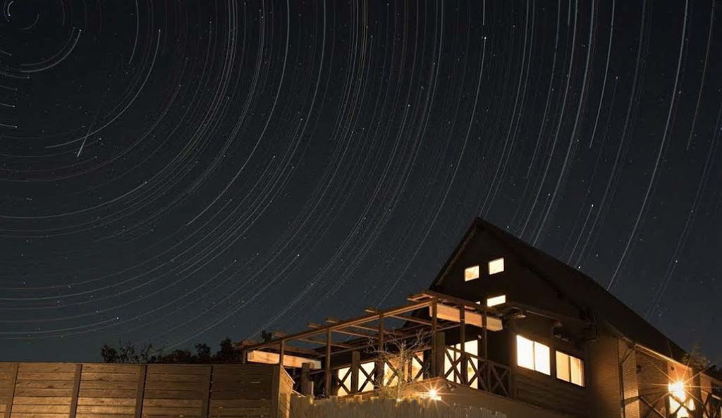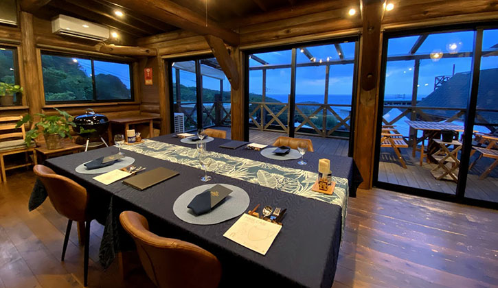 コテージ玄関前から続くのは、広々としたウッドデッキ。大屋根とタープの下には、デッキソファ&テーブル、ハンモック&ブランコなどを設置しており、海からの風を感じながらゆっくりと寛げる空間となっています。また、コテージ1階の個室から続くのは3階建てのウッドデッキ。ロフトの窓からも2階デッキに出ることができ、そこからさらに梯子で3階部分の見晴台に上がれば、秋~春には水平線に沈む夕陽を望むことができ(10月中旬頃~3月中旬頃まで)、冬の晴れた日には満天の星空を眺めることができます。