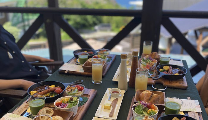 宿泊棟コテージとは別棟となるレストラン棟と屋外施設の足湯デッキの2ヶ所のお食事場所を設けております。お食事はご夕食ご朝食ともに、基本レストランでのご用意となりますが、気候の良い時季には、レストランデッキや足湯デッキでご朝食をご用意させていただくこともございます。※お食事場所のご指定はお受けしておりません。