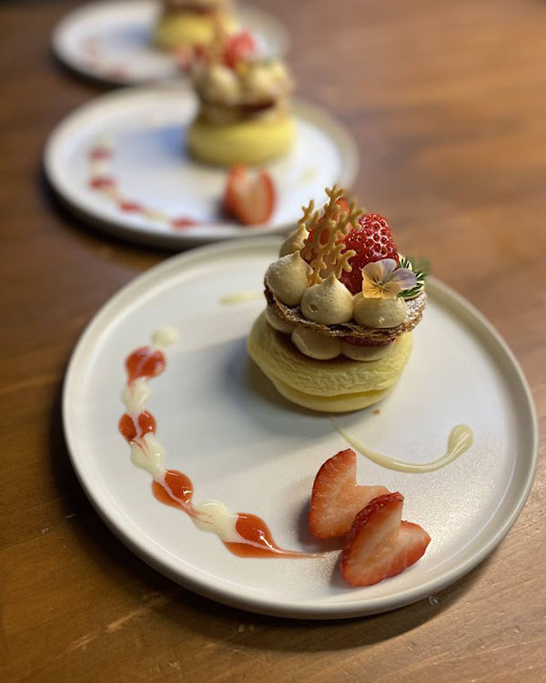 コースの定番デザート「ふわふわパンケーキ」をコースごとに毎回違ったフレーバーでご用意しております。記念日でのご利用には、メッセージをお入れするサービスを承っておりますので、ご希望の場合は事前にお申し付けください。(※当日は対応不可となります)